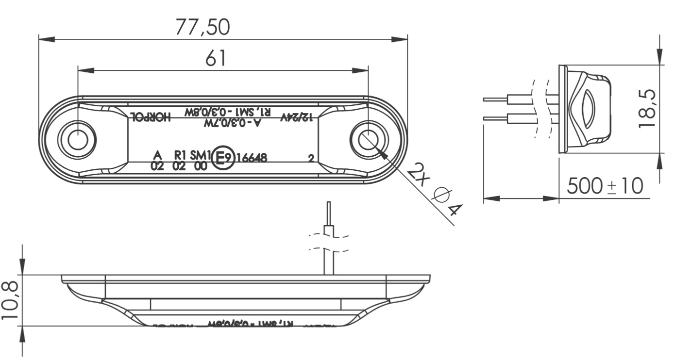 Svítilna poziční LED 12/24V červená 77,5 x 18,5mm Horpol