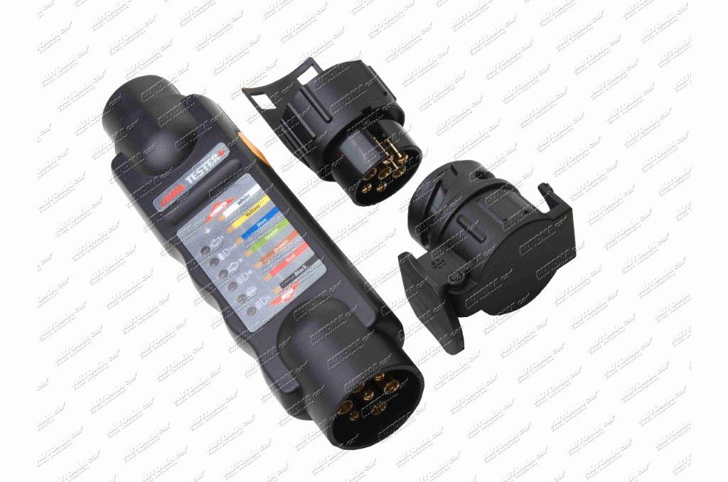 Tester 7P zásuvek a zástrček přívěsů 12V včetně adaptérů 7/13,13/7 napájení baterie 9V není součástí