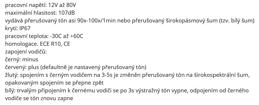 Signalizace couvání 12-80V 107dB IP67